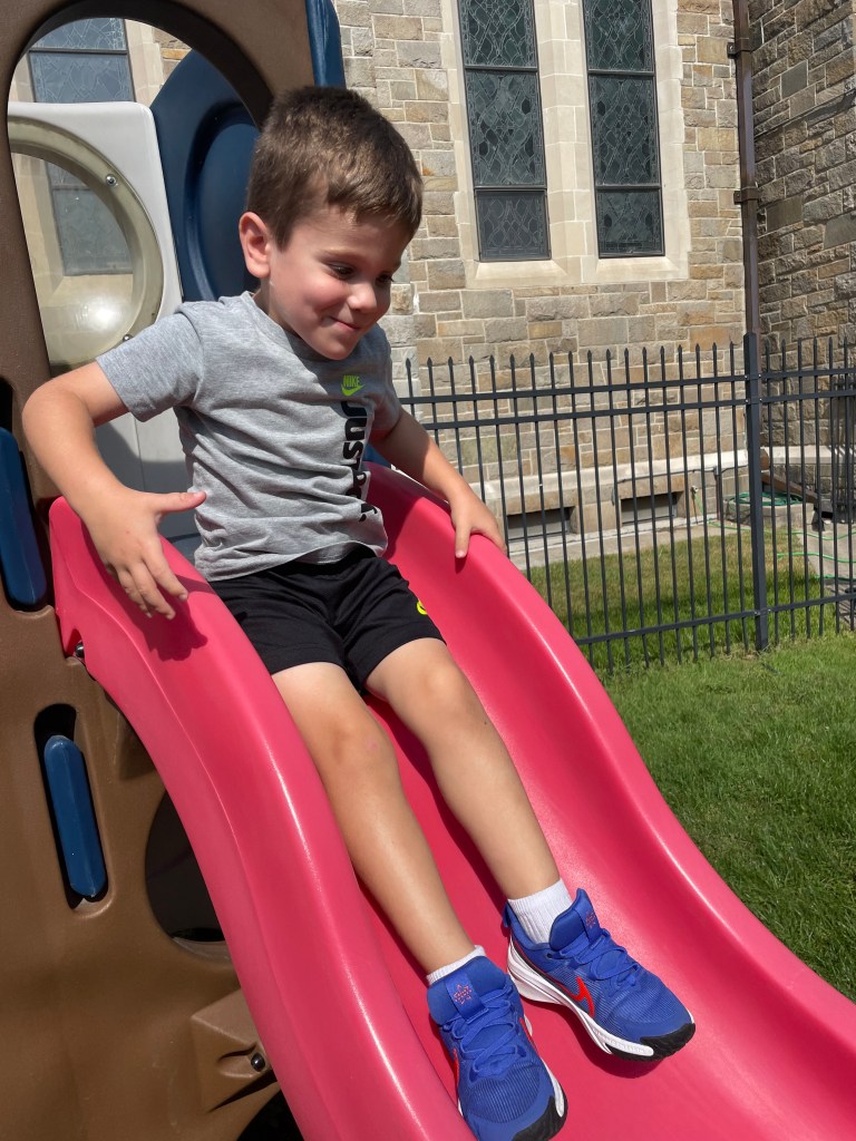 Outdoor Play and Indoor Recess: We are very fortunate to have a large, beautiful, fenced in playground and we make use of it all year long! We know little bodies need to move and pride ourselves in making sure our students get outside almost every day; even throughout the winter! When severe cold or rain keeps us in, we still have recess down in our gym with mats, slides, and all kinds of gross motor skills play.